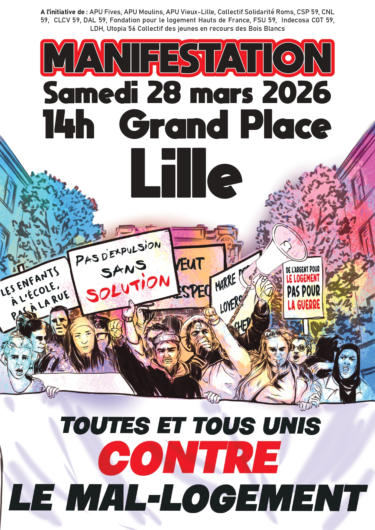 Organisateurs et organisatrices : APU Fives, APU Moulins, APU Vieux-Lille, Collectif des jeunes en recours des Bois Blancs, Collectif Solidarité Roms, CSP 59, CNL 59, CLCV 59, DAL 59, Fondation pour le logement Hauts de France, FSU 59, Indecosa CGT 59, LDH Lille, Utopia 56
